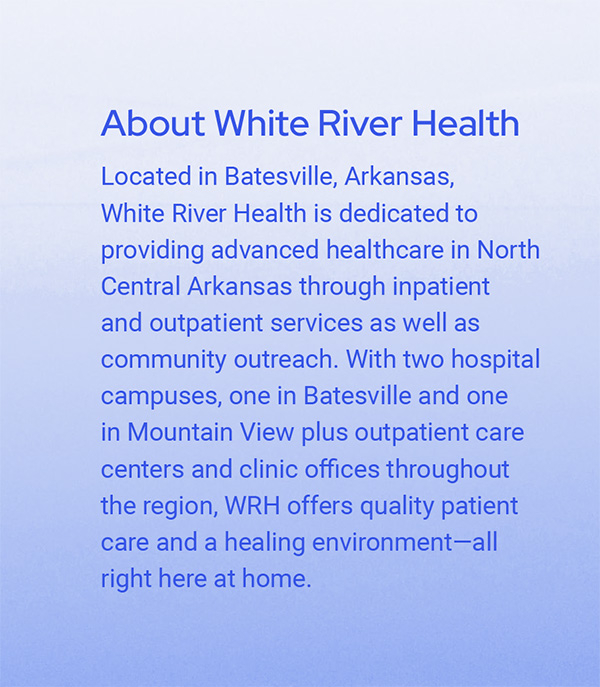 Located in Batesville, Arkansas, White River Health is dedicated to providing advanced healthcare in North Central Arkansas through inpatient and outpatient services as well as community outreach. With two hospital campuses, one in Batesville and one in Mountain View plus outpatient care centers and clinic offices throughout the region, WRH offers quality patient care and a healing environment—all right here at home.
