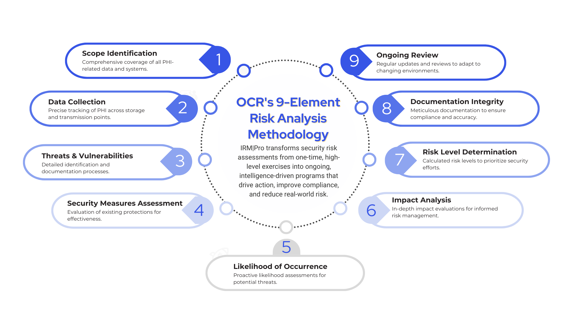 These are the nine essential elements OCR expects to see. Every IRM|Analysis engagement is mapped directly to these elements, ensuring that your assessment is not only defensible, but fully aligned with regulatory expectations.
